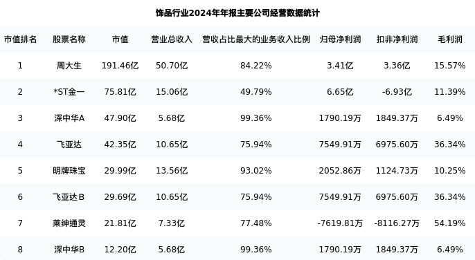 莱绅通灵最新报告期数据为年报,下表汇总了饰品行业内市值靠前的公司年报主要经营数据