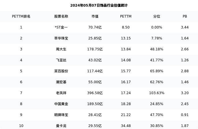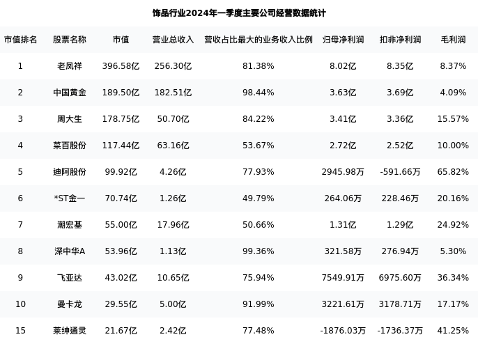 莱绅通灵最新报告期数据为一季度,下表汇总了饰品行业内市值靠前的公司一季度主要经营数据
