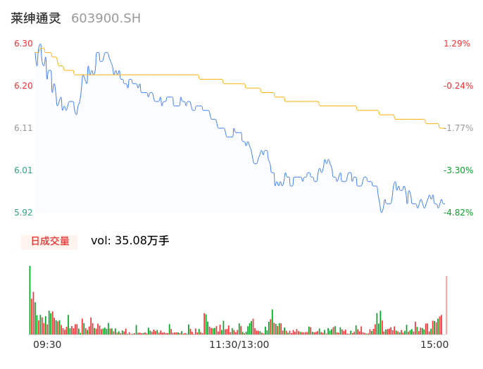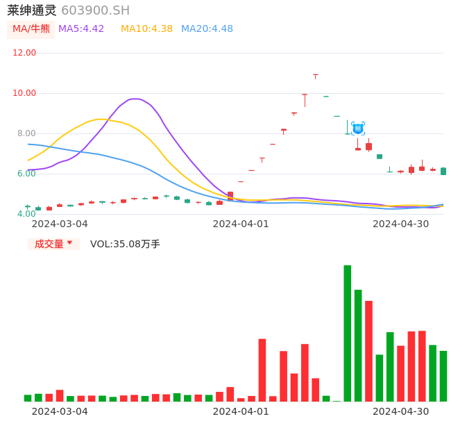 04月30日,莱绅通灵收报5.95,股价涨幅-4.34%,成交金额2.14亿元,换手率10.30%。