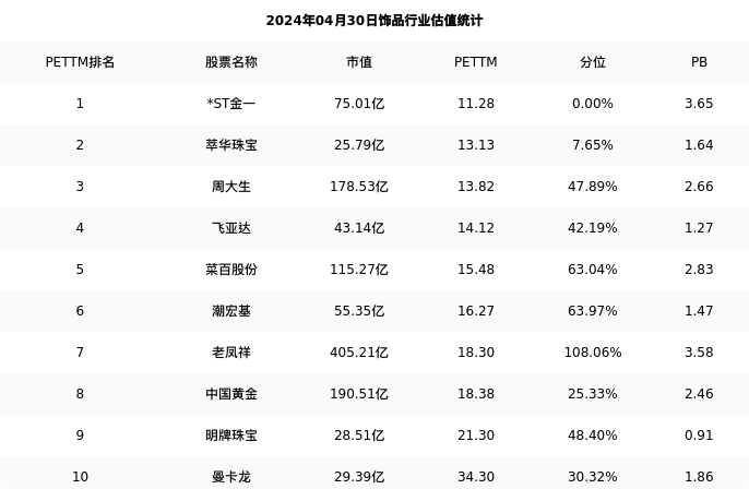 莱绅通灵最新报告期数据为一季度,下表汇总了饰品行业内市值靠前的公司一季度主要经营数据