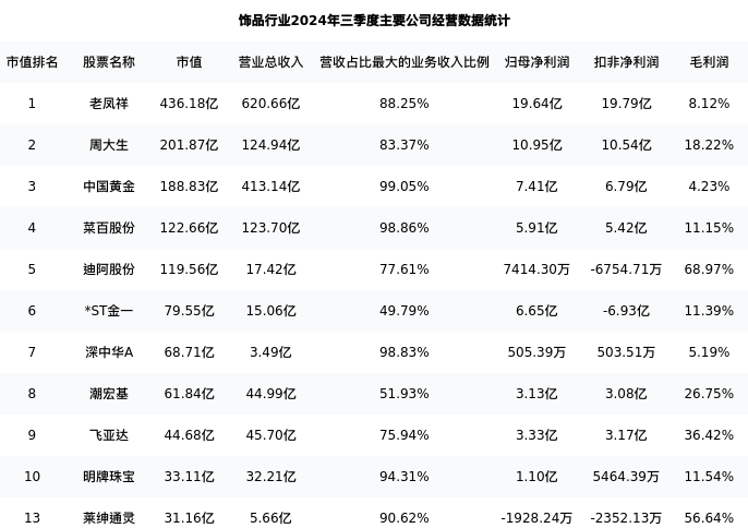 莱绅通灵最新报告期数据为三季度,下表汇总了饰品行业内市值靠前的公司三季度主要经营数据