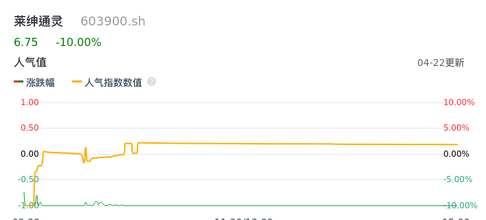 04月22日,莱绅通灵收报6.75,股价涨幅-10.00%,成交金额2.20亿元,换手率9.53%。