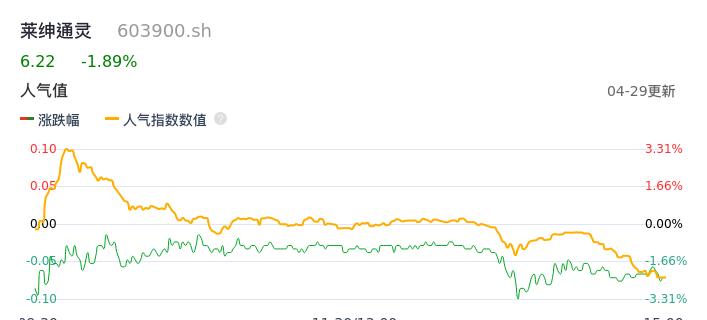 04月29日,莱绅通灵收报6.22,股价涨幅-1.89%,成交金额2.43亿元,换手率11.49%。