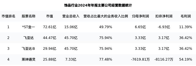 莱绅通灵最新报告期数据为年报,下表汇总了饰品行业内市值靠前的公司年报主要经营数据