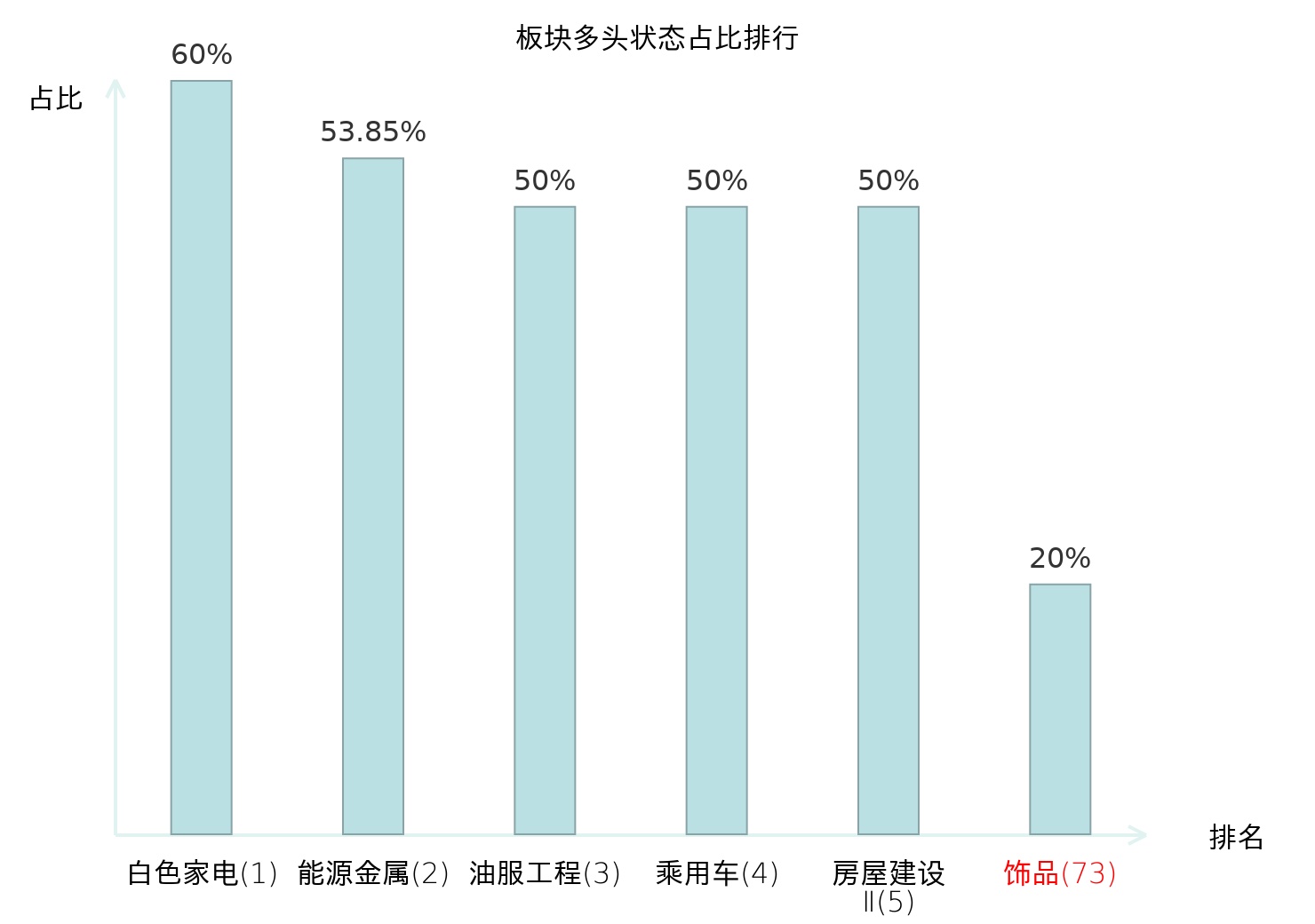 全市场所有行业板块中主力多头状态占比排名中,白色家电板块位居第一。油气开采Ⅱ板块名次提升最快,较昨日上升45位。