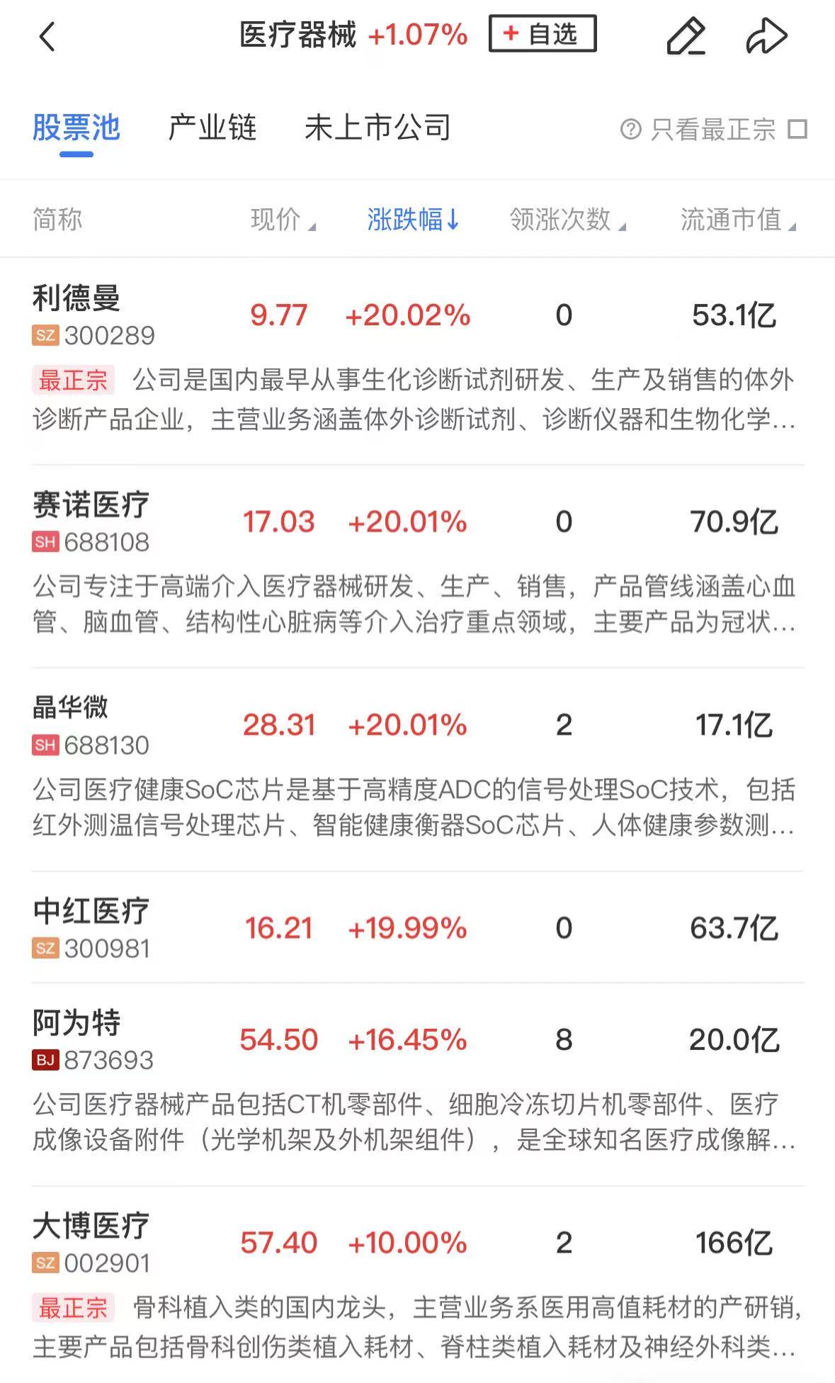 医疗器械概念同样表现活跃,利德曼赛诺医疗中红医疗大博医疗科华生物尚荣医疗涨停。