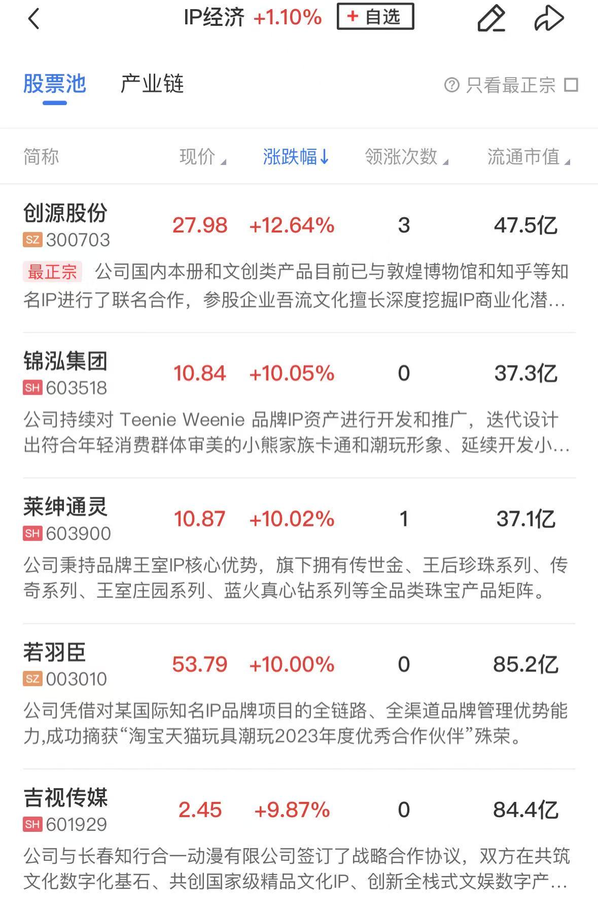 IP经济概念股展开反弹,锦泓集团莱绅通灵吉视传媒涨停,曼卡龙天娱数科潮宏基涨幅居前。