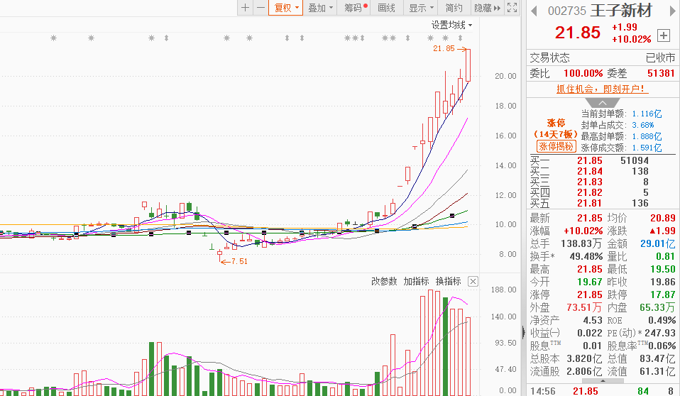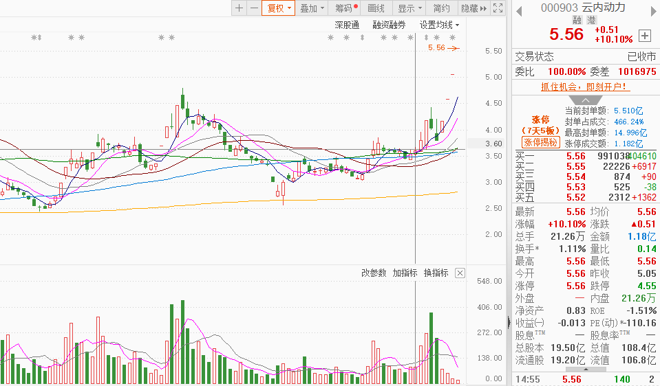 市场情绪:市场终结了5连阴,迎来放量反弹,热点轮番活跃,个股涨多跌少,全市场超4400只个股上涨,逾百股涨停。今日共108股涨停,连板股总数23只,16股封板未遂,封板率为87%(不含ST股、退市股)。焦点股方面,核电板块中超控股19天12板、王子新材14天7板、尚纬股份6连板、融发核电5连板,无人物流车概念股通达电气7天6板、云内动力7天5板。