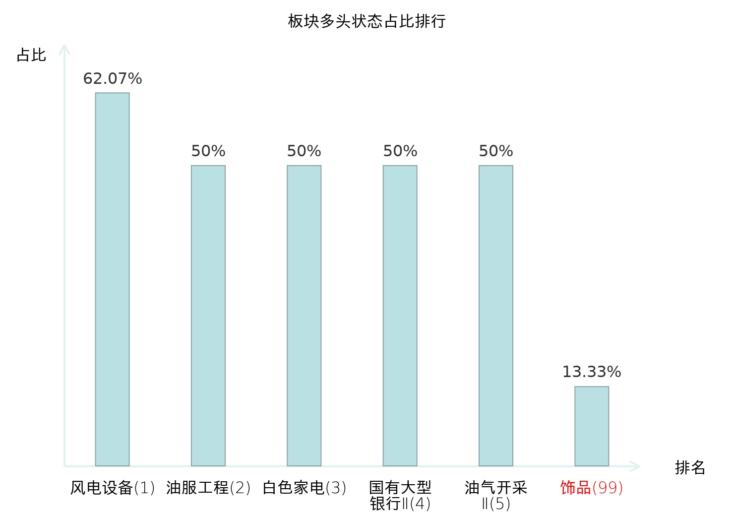 全市场所有行业板块中主力多头状态占比排名中,风电设备板块位居第一。动物保健Ⅱ板块名次提升最快,较昨日上升64位。