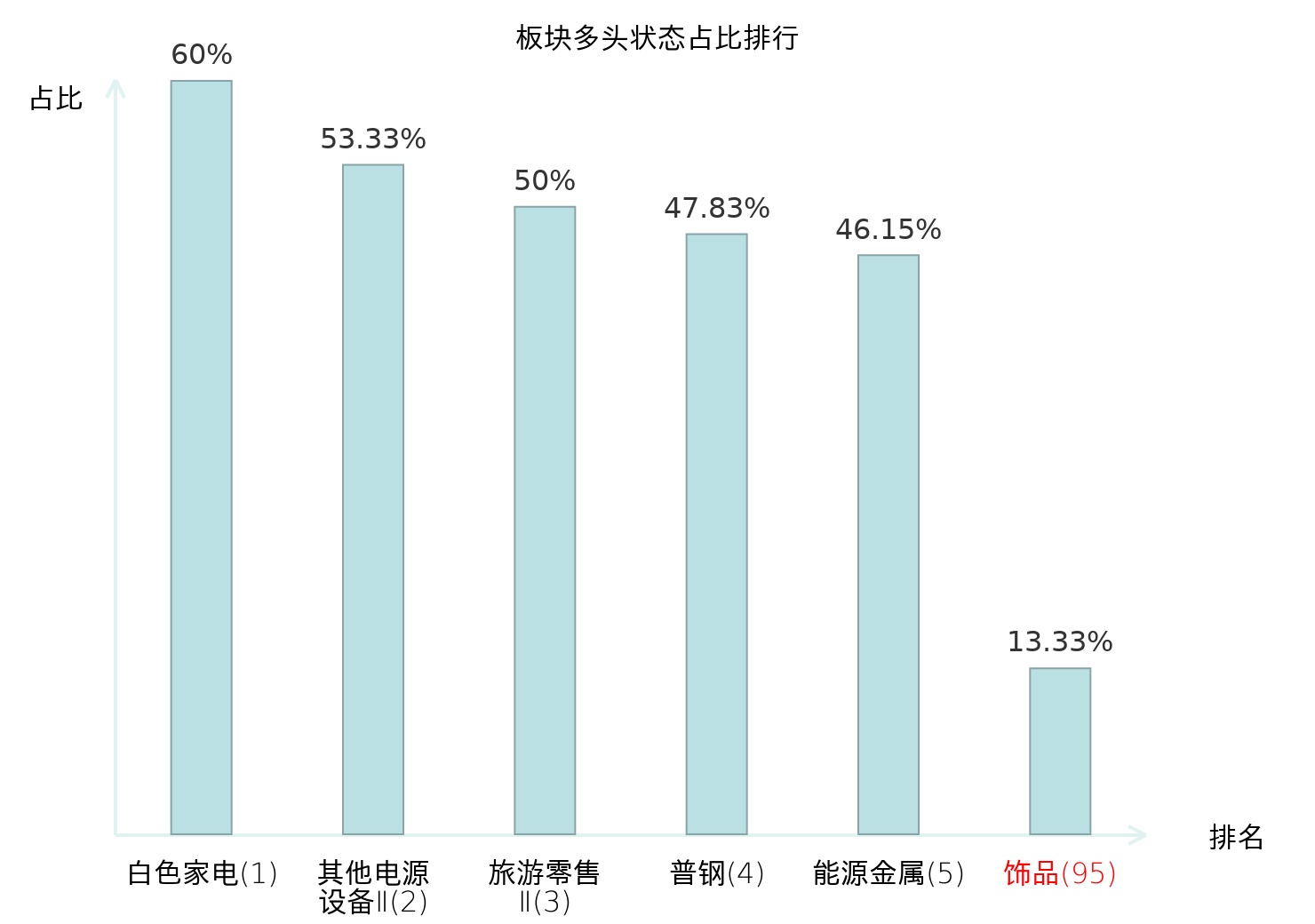 全市场所有行业板块中主力多头状态占比排名中,白色家电板块位居第一。照明设备Ⅱ板块名次提升最快,较昨日上升55位。