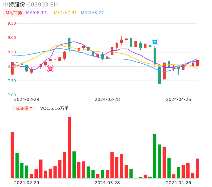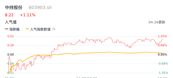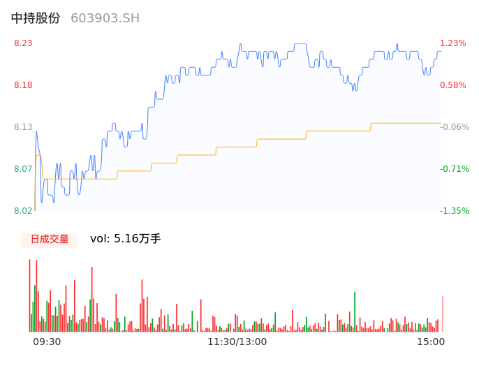 04月26日,中持股份收报8.22,股价涨幅1.11%,成交金额4200.27万元,换手率2.55%。