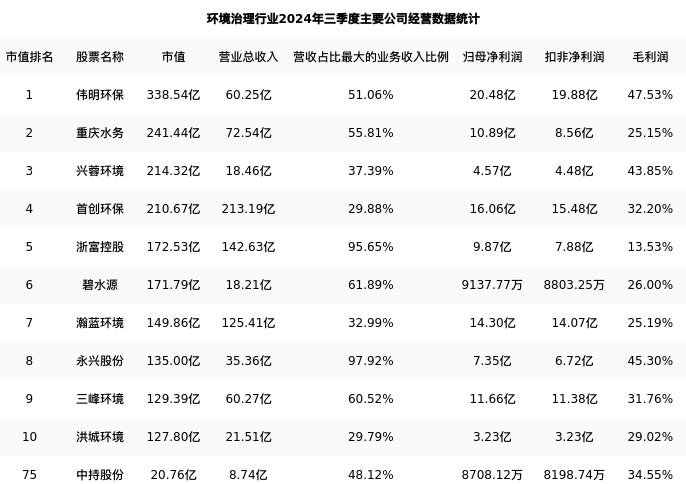 中持股份最新报告期数据为三季度,下表汇总了环境治理行业内市值靠前的公司三季度主要经营数据