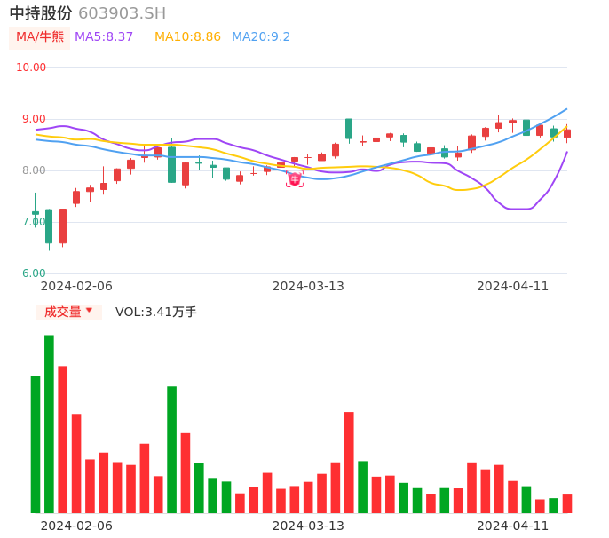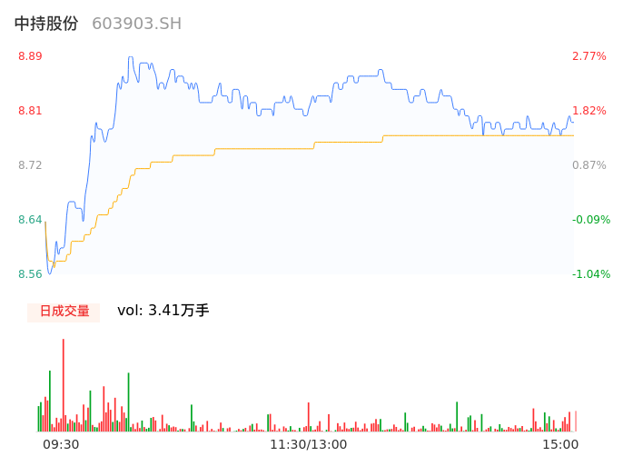 04月11日,中持股份收报8.79,股价涨幅1.62%,成交金额2989.98万元,换手率1.68%。