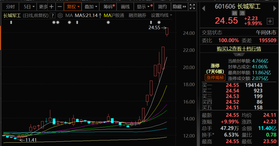 军工股继续保持强势上攻态势,地面兵装板块指数在昨日飙升近9%的基础上,今日继续高开高走,盘中放量大涨逾7%,创8年多来新高,6月以来累计大涨逾32%,今年以来涨逾51%。长城军工再度涨停,收获7天6涨停,股价创历史新高;北方导航建设工业等也纷纷涨停或涨超10%。