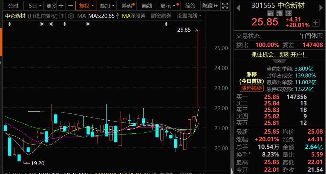 固态电池概念早间再度高开高走,板块指数连续第5日上涨,创近3年来新高。中仑新材开盘仅约2分钟就垂直20%涨停,创年内新高;东方锆业普路通华锋股份天际股份等也纷纷强势涨停。