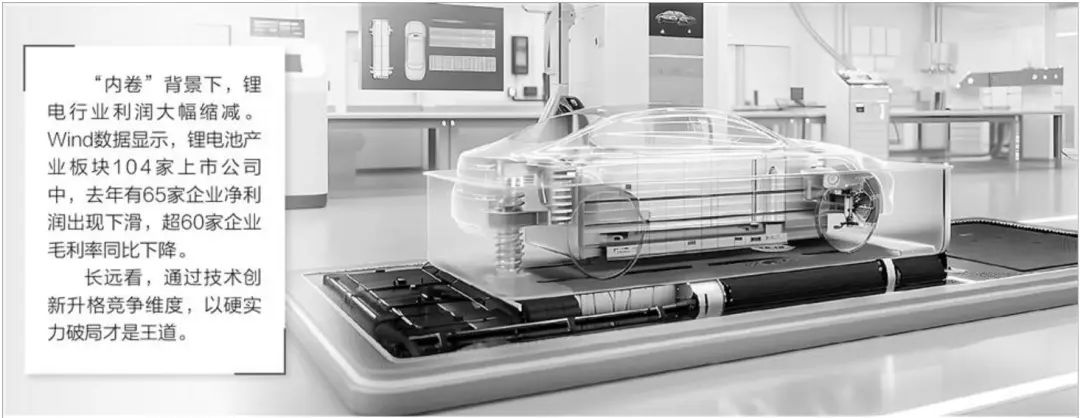 “内卷”背景下,锂电行业利润大幅缩减。Wind数据显示,锂电池产业板块104家上市公司中,去年有65家企业净利润出现下滑,超60家企业毛利率同比下降。