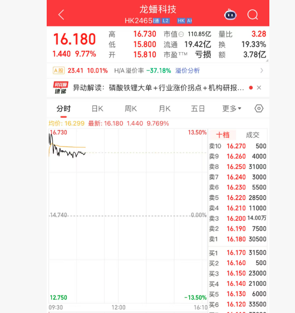 上证报中国证券网讯12月3日,龙蟠科技H股开盘上涨,最高涨幅13.50%,截至10时49分,龙蟠科技报16.18港元/股,涨9.77%。