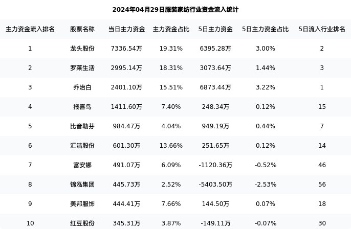 从主力资金流向来看,服装家纺行业今日主力资金流入10.85亿元,在所有申万二级行业中排名:129/131。