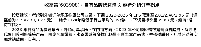 值得注意的是:2024年04月国泰君安的王佳/赵博/曹冬青分析师,首次发布关于牧高笛的研究报告,标题为:牧高笛(603908):自有品牌快速增长 静待外销订单拐点。