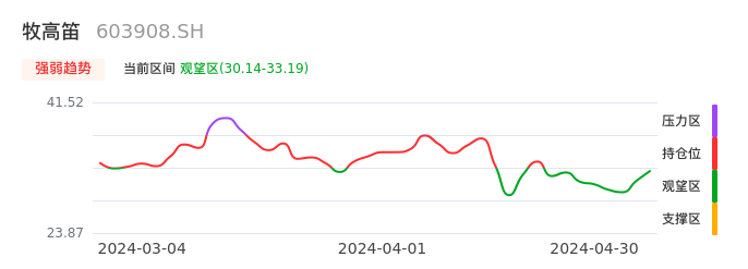 我们来看一下该股的九方特色指标强弱趋势的情况:牧高笛自04月19日从持仓区下穿到观望区。股价近期持续下跌后,短期出现止跌迹象。后续重点关注能否再次站上多空分界点:33.19元。如未能有效突破则可能进入新一轮空头行情。