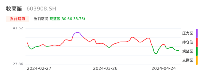 我们来看一下该股的九方特色指标强弱趋势的情况:牧高笛自04月19日从持仓区下穿到观望区,股价近期持续走弱。短期已经进入空头行情,且下跌动能仍未衰竭。建议继续谨慎观望。