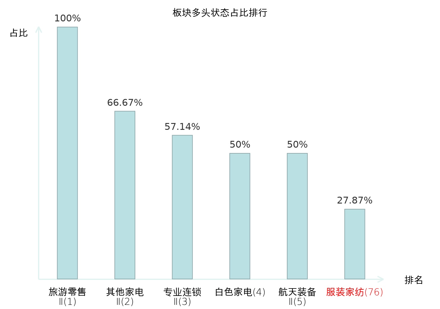 全市场所有行业板块中主力多头状态占比排名中,旅游零售Ⅱ板块位居第一。股份制银行Ⅱ板块名次提升最快,较昨日上升79位。