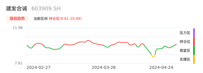 我们来看一下该股的九方特色指标强弱趋势的情况:建发合诚近日从观望区上穿到持仓区。股价短期站稳多头区域,上升动能仍较为充足,可积极关注。后续重点关注上方压力位:10.49元是否能突破上攻。