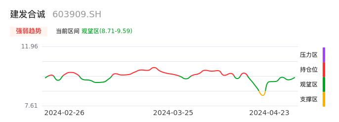 我们来看一下该股的九方特色指标强弱趋势的情况:建发合诚自04月17日从支撑区回到观望区。股价前期快速下跌后经过中途弱势整理。目前短期处于弱势反弹迹象,后续重点关注能否站上多空分界点:9.59元。如未能有效突破则说明弱势反弹行情结束。后续可能再次进入空头行情。