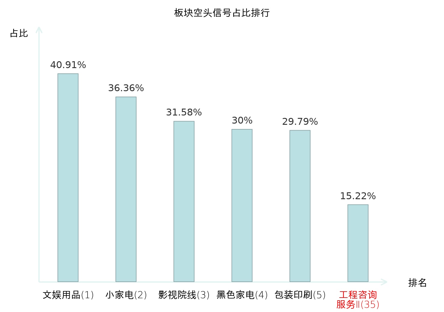 全市场所有行业板块中主力空头信号占比排名中,文娱用品板块位居第一。包装印刷板块名次提升最快,较昨日上升124位。