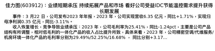 值得注意的是:2024年04月长城证券的侯宾分析师,首次发布关于佳力图的研究报告,标题为:佳力图(603912):业绩短期承压 持续拓展产品和市场 看好公司受益IDC节能温控需求提升获得长期发展。
