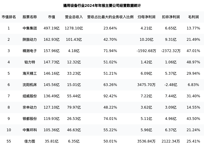佳力图最新报告期数据为年报,下表汇总了通用设备行业内市值靠前的公司年报主要经营数据