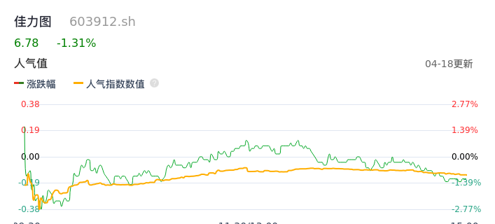 04月18日,佳力图收报6.78,股价涨幅-1.31%,成交金额7835.06万元,换手率2.12%。