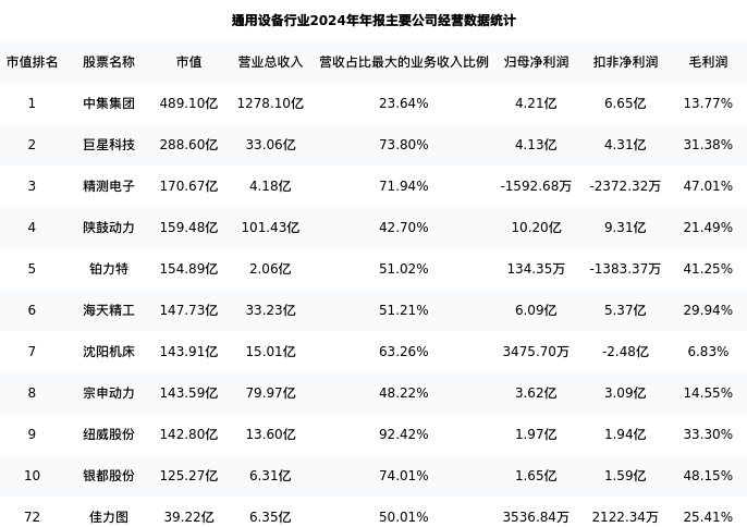 佳力图最新报告期数据为年报,下表汇总了通用设备行业内市值靠前的公司年报主要经营数据