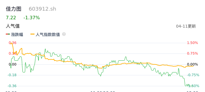 04月11日,佳力图收报7.22,股价涨幅-1.37%,成交金额9085.07万元,换手率2.29%。