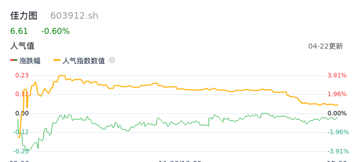04月22日,佳力图收报6.61,股价涨幅-0.60%,成交金额5681.25万元,换手率1.60%。