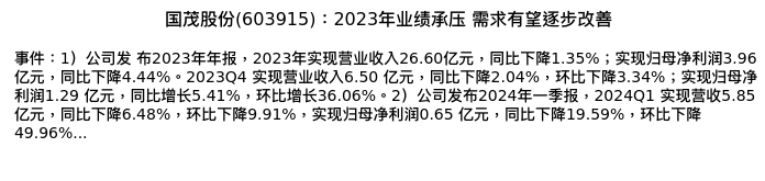 值得注意的是:2024年04月西南证券的邰桂龙/周鑫雨分析师,首次发布关于国茂股份的研究报告,标题为:国茂股份(603915):2023年业绩承压 需求有望逐步改善。