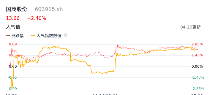 04月29日,国茂股份收报13.66,股价涨幅2.40%,成交金额5272.60万元,换手率0.59%。