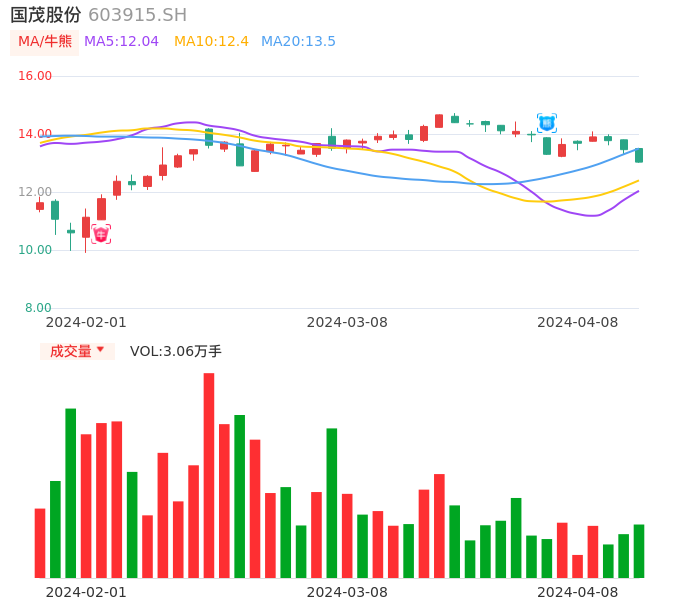 04月08日,国茂股份收报13.03,股价涨幅-3.19%,成交金额4035.42万元,换手率0.47%。