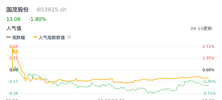 04月10日,国茂股份收报13.06,股价涨幅-1.80%,成交金额2557.05万元,换手率0.30%。