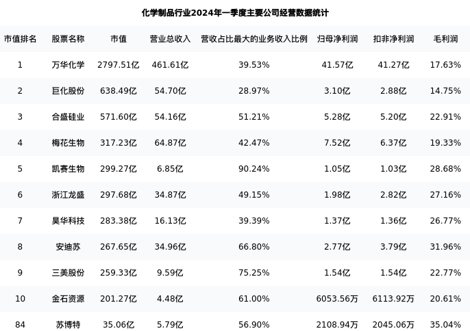 苏博特最新报告期数据为一季度,下表汇总了化学制品行业内市值靠前的公司一季度主要经营数据