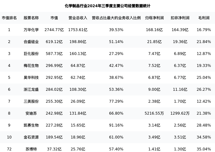 苏博特最新报告期数据为三季度,下表汇总了化学制品行业内市值靠前的公司三季度主要经营数据