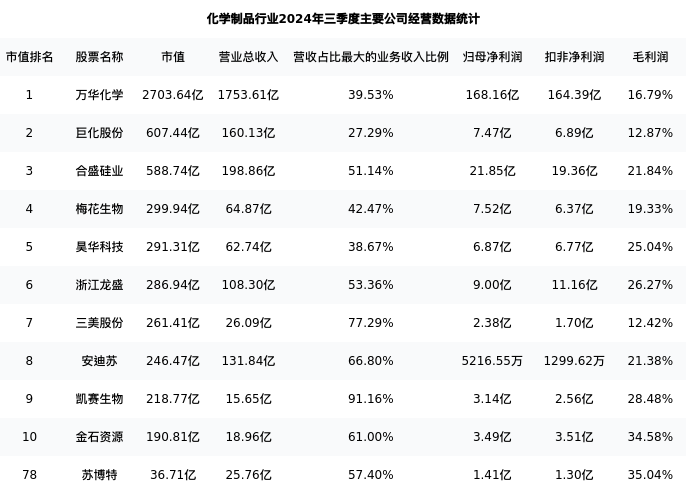 苏博特最新报告期数据为三季度,下表汇总了化学制品行业内市值靠前的公司三季度主要经营数据
