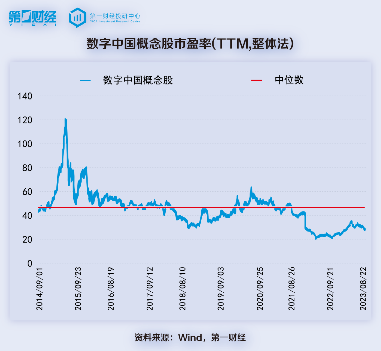 纵向看,数字中国概念股PE过去十年中位数水平为47倍,当前30倍PE处于历史估值低位。