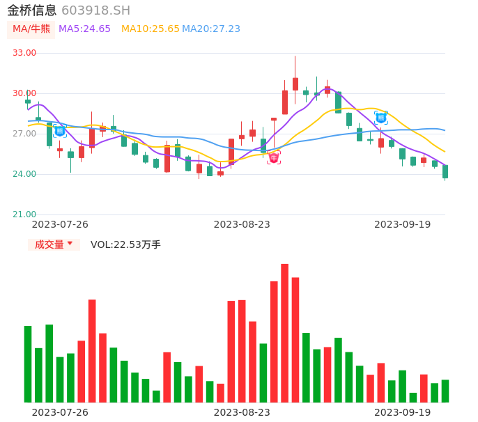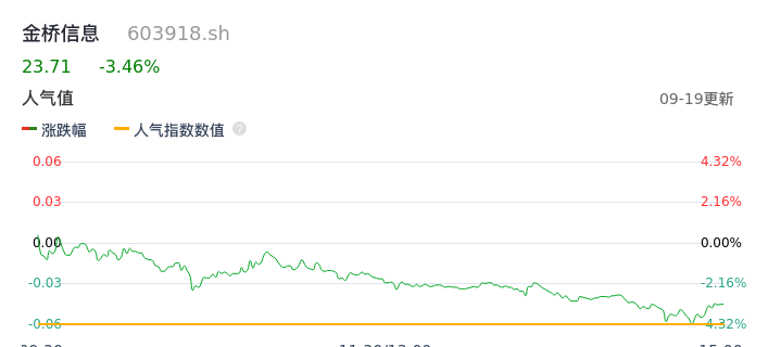 09月19日,金桥信息收报23.71,股价涨幅-3.46%,成交金额5.41亿元,换手率6.16%。
