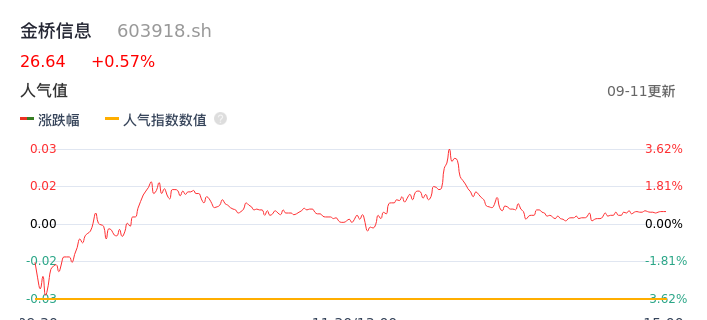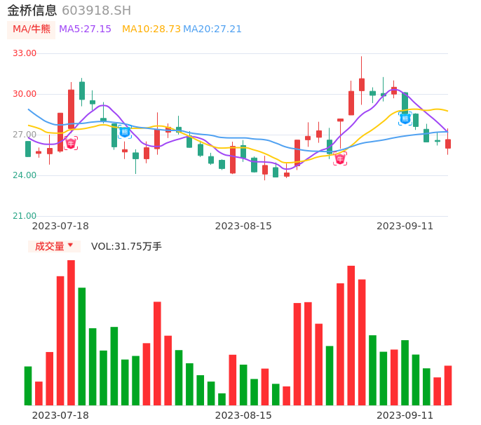 09月11日,金桥信息收报26.64,股价涨幅0.57%,成交金额8.45亿元,换手率8.69%。