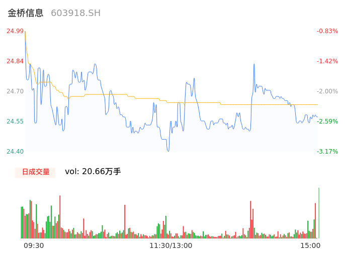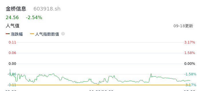 09月18日,金桥信息收报24.56,股价涨幅-2.54%,成交金额5.09亿元,换手率5.65%。