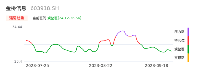 我们来看一下该股的九方特色指标强弱趋势的情况:金桥信息自09月06日从持仓区下穿到观望区,股价近期持续走弱。短期已经进入空头行情,且下跌动能仍未衰竭。建议继续谨慎观望。
