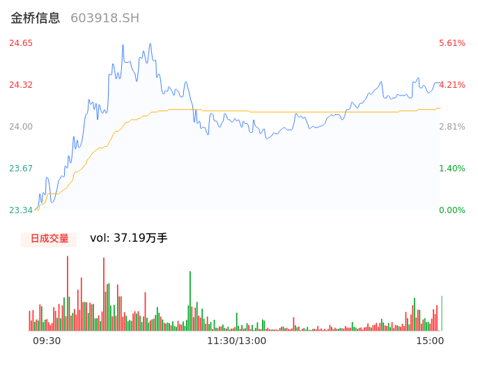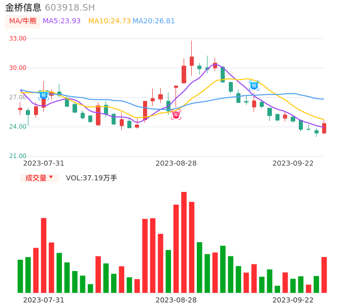 09月22日,金桥信息收报24.32,股价涨幅4.20%,成交金额8.98亿元,换手率10.16%。