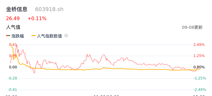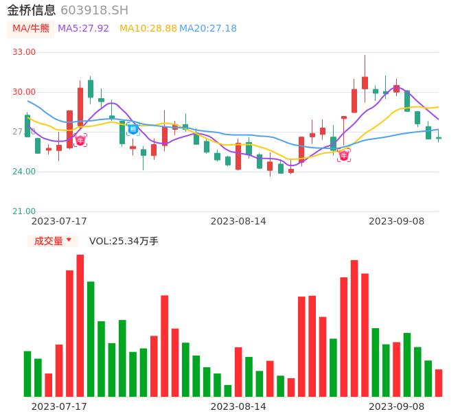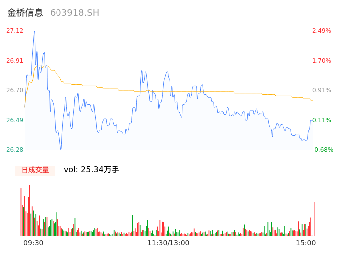09月08日,金桥信息收报26.49,股价涨幅0.11%,成交金额6.75亿元,换手率6.93%。