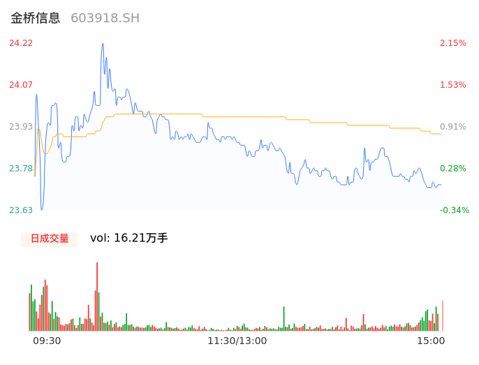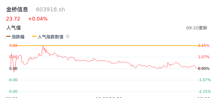 09月20日,金桥信息收报23.72,股价涨幅0.04%,成交金额3.87亿元,换手率4.43%。